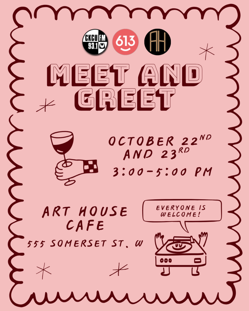 Join us at Art House Café next week for a special meet and greet with some community organizations: CKCU’s station director, Lia Kiessling; Apartment613’s Elyse Van Herk; and Art House owner Geneviève Bétournay.